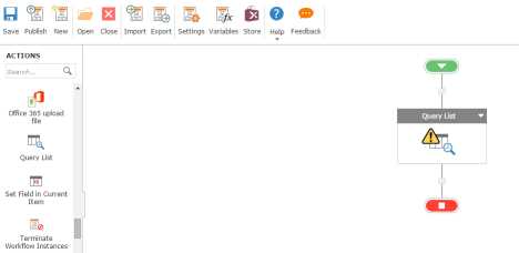 - Add the action, “Query List” either by right click on the workflow or by dragging and dropping from the left toolbox.