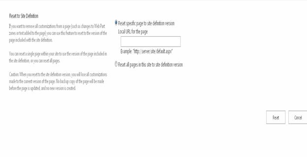 Reset to Site DefinitionsNext we have Reset to Site Definitions, here if you have any custom page and you want to revert it back to a default page without all custom changes and custom web parts. You need to put the URL of that specific page and reset its specific default layout or if you want all the pages to be Reset you can choose the other option.