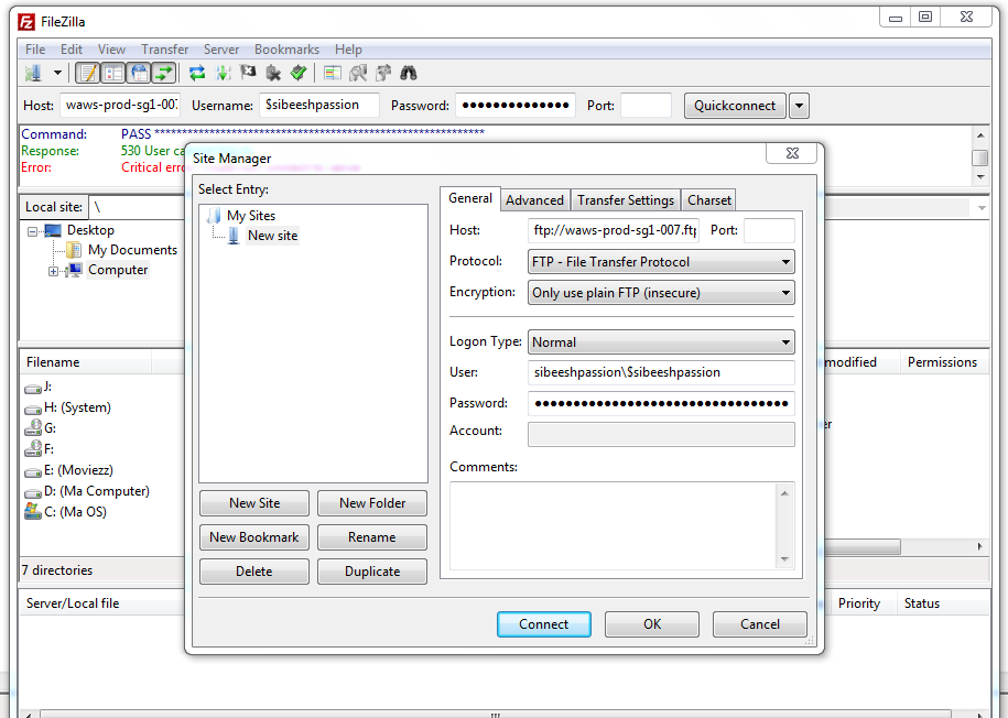 Now download the Filezilla application that makes your file transferring much easier than anything. Open it and paste the FTP details (FTP address, user name and password) that you copied from the downloaded file from Azure.