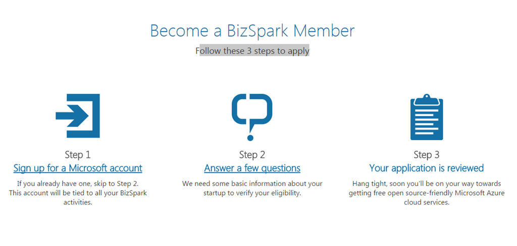 It is so easy to join it. Go to Bizspark and click on "Join Bizspark".