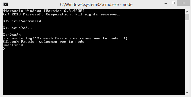 Once you pointed out to your drive as shown in the image, type “node” and press Enter. Now you can type anything in your console using console.log. Then you will get the output as shown in the preceding image.