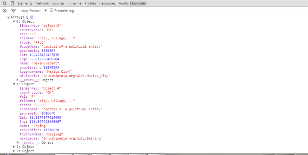 Now if you write the response.geonames in the success in the browser console as follows, you will get the array as shown below.