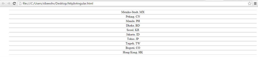 In the preceding code we are using the $http.get() method of Angular. In the URL part we have given a sample web service URL of geo data. You can get these free