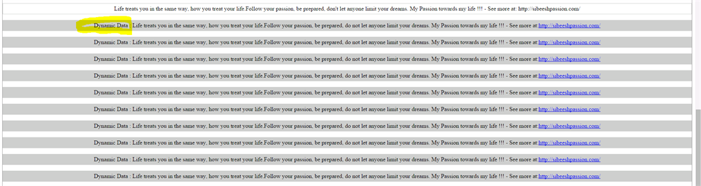 - html += '<p class="dynamic">Dynamic Data : Life treats you in the same way, how you treat your life.Follow your passion, be prepared, do not let anyone limit your dreams. My Passion towards my life !!! - See more at:<a href="http://sibeeshpassion.com/">http://sibeeshpassion.com/</a> </p>';