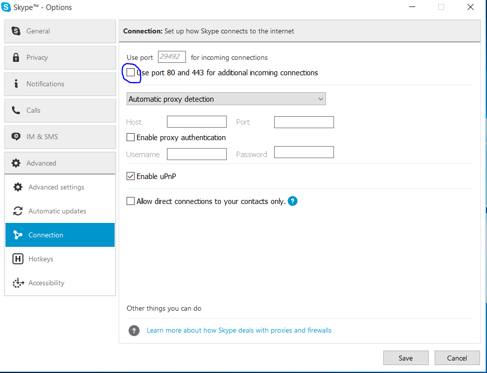 Here we are going to change the port of Skype. To do that Open your Skype application. Go to Tools, then Options. Click on advanced options from the left side and click on Connection tab. Now you can find an option which says use port 80 and 443 as alternative for incoming connections. Please uncheck that box and click on save.