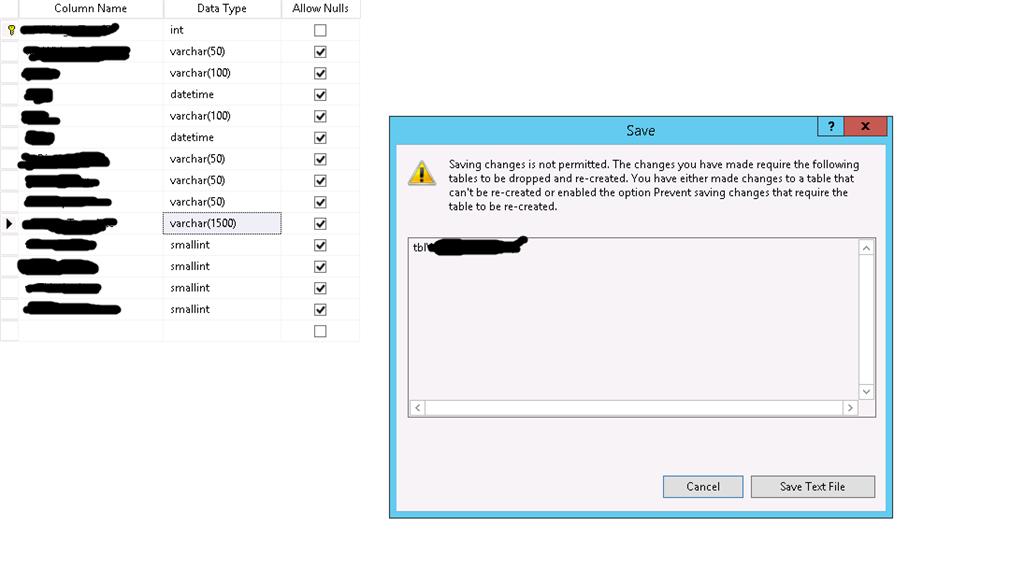 “Saving changes is not permitted, the changes you have made require the following table to be dropped and re-created. You have either made changes to the table that can't be re-created or enabled the option Prevent saving changes that require the table to be re-created”.