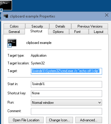 %windir%\System32\cmd.exe /c “echo off | clip”