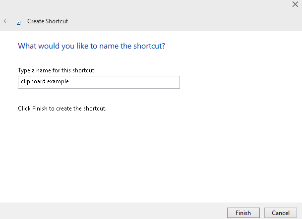 Now after typing this line into the TextBox field you have a Next button to click on then you will have a new popup window as in the following picture. This window asks for the name of the shortcut. Here we are free to make any name as we desire. Here I make the name clipboard example. You can choose one as you desire.
