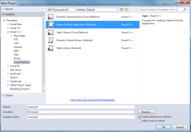 Select the Native-Activity Application (Android ) Visual C++ that is present in the second row of your template field.