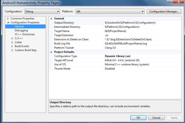 Then go to the Solution Explorer, select the Android 5.Native activity file. Right-click on it, go to its properties and save the properties like this.
