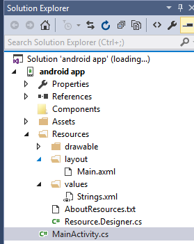 After selecting the Blank app (Android) in you Solution Explorer an Android app is created that has some files.