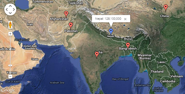 Now when you run your code in the browser there will be a map shown with markers. When you click on any marker then it shows the country name and its population because here we use the country name and its population for the proceeding the output, as you see in the preceding output.