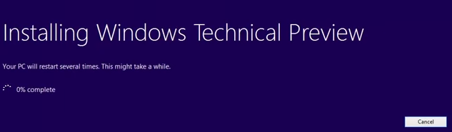 When you click on the install button your window will install and you will get a message as in following picture. This will also run from zero percent to a hundred percent so it also might require some time. One thing to note there is that during this process your PC will we restarted many times.