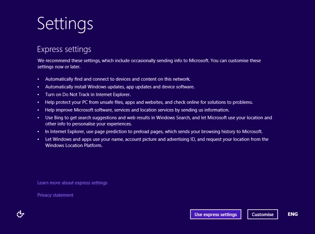 Now your system will be restarted and then you will see a window. That window shows the settings. Here there are two options, one is to use express settings and another is to customize settings, here I use the express settings, the window looks like this.