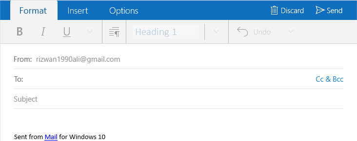 Here we have a taskbar above of it. In that first option is Format. The second is Insert, the third is options. In the Format option we can select the format for the text, like bold, italic, headings and so on. The second option is Insert. We can insert an image, file, table, link and so on into our composed mail. The last (third) option, Options, is for selecting the language and check the spelling for our composed mail. At the corner of this window we have the Discard and send link.