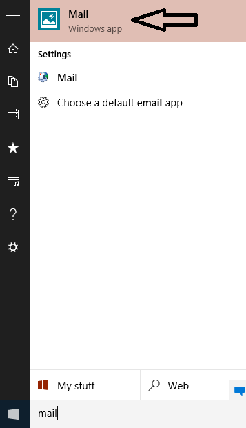 Go to your taskbar. There you will see the Cortana search bar, in Cortana search bar type mail. When you type mail into it then at the top of the results you will see the Mail Window app icon, just as in the following picture.
