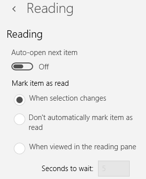 the next option in the Settings is Reading. Here we can manage those mails that are read by us. Here we can select the auto open property for them. We can also use the marked property, in other words those emails marked that we read already.