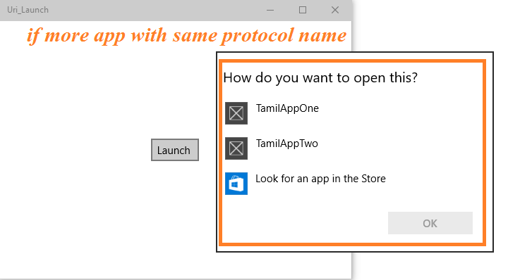 In the store there may be two apps with the same name (by coincidence). It will then allow you to choose among them. For example, I created another app named “TamilAppTwo” with the same protocol name as “iamtamilanselva” and deployed it in my local machine. Then now I run my Uri_Launch app and through that I click the launch button. It shows me as in the following screenshot that all me to choose apps.
