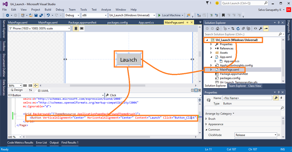 - Add a Button to launch a button when clicking on it using the following XAML code and C# Code: