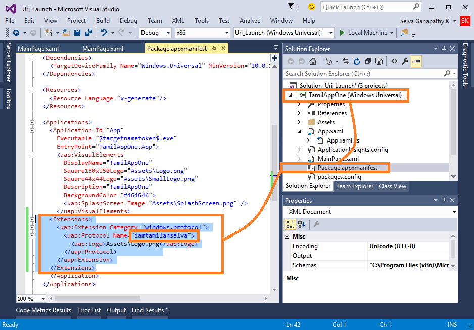 - Create a dummy App to launch and add a protocol ID in the Package Manifest as in the following tags.