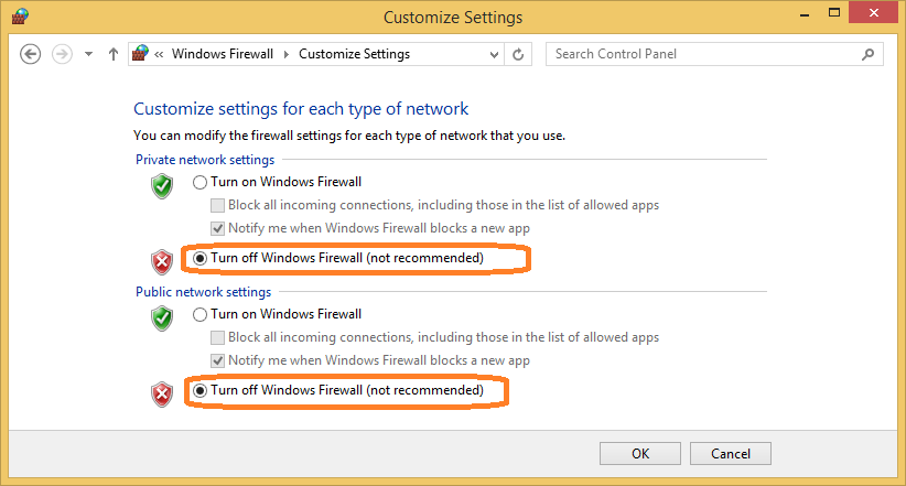 - Open “Customize Window” Windows from Control Panel\All Control Panel Items\Windows Firewall\Customize Settings.