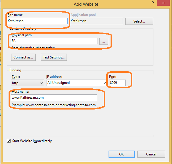 - Fill in the necessary details in the dialog as required like SiteName (it will not affect your domain name, it's just the name of your site's name and will not be reflected in your web address), physical path, port (80 as default) and host name (not mandatory). Also check "Start website immediately" to ready to publish.