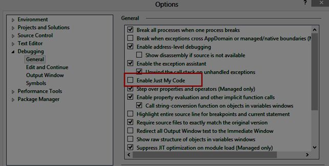 Solution: Disable the "Just My Code" option in the Debug/General settings.
