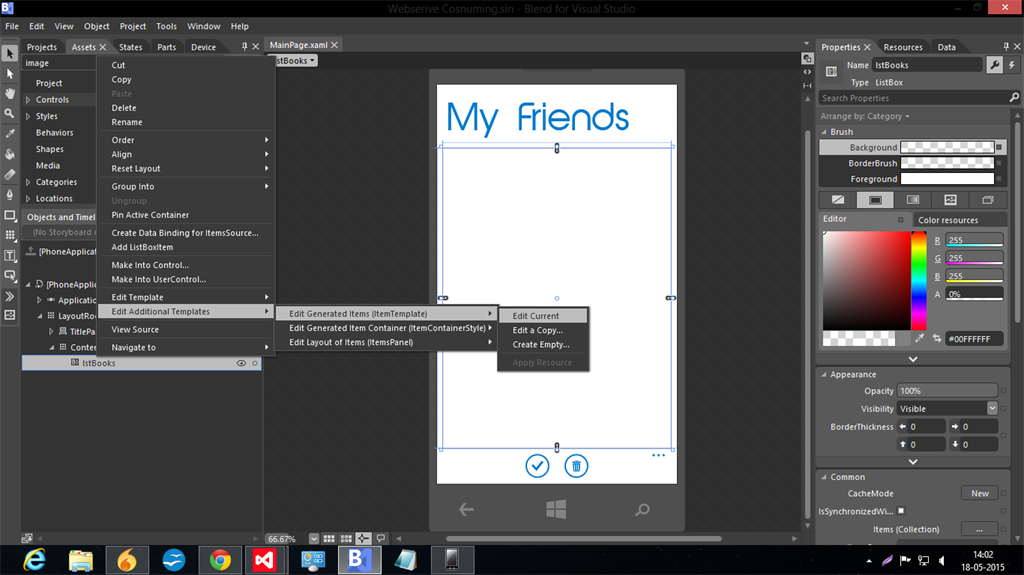 You can right-click the page that has the list view then select Open it in Blend then Expand the Visual Tree as shown.