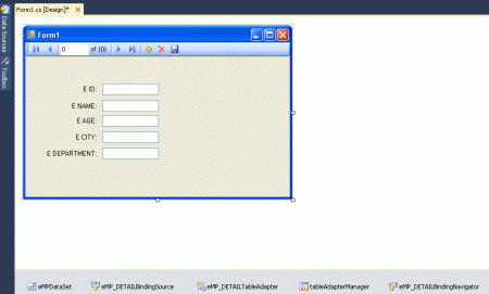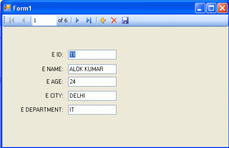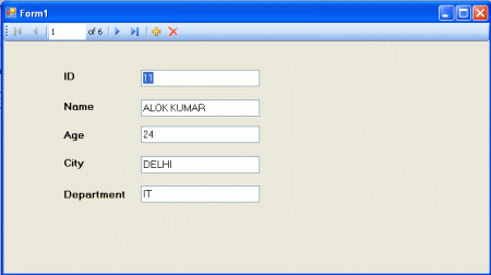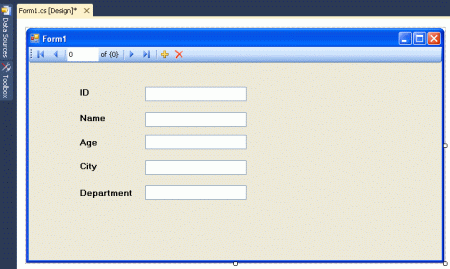 Create a another form and add a BindingNavigator, five Labels and five TextBoxes. Set the Text property of Labels as "ID", "Name", "Age", "City", and "Department" and the Name property of the TextBoxes as "txtid", "txtname", "txtage", "txtcity" and "txtdepartment".