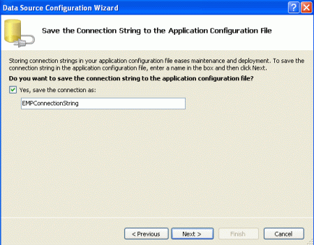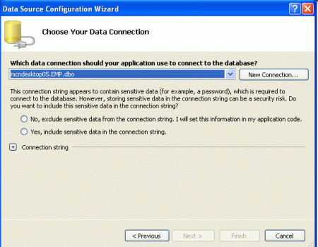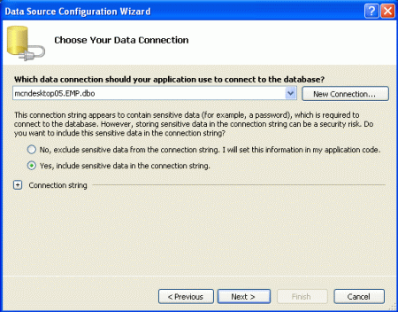 Step 7 : Click ok button. You will be back to "Data Source Configuration Wizard". Check the radio button for "Yes, include sensitive data in the connection string" and click the next button.