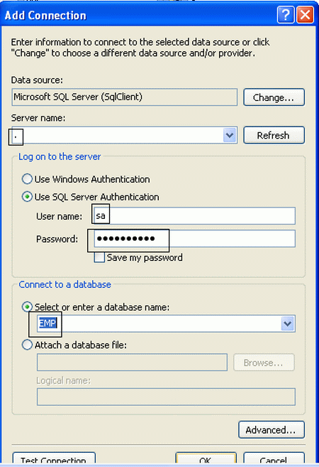 Step 6 : Write the server name, user name, password and select your Database name. Click ok button.