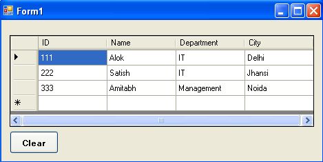 (removes) all data from datatable. Take a button and write the following code on click event.