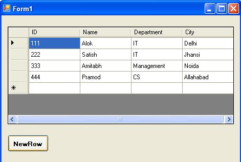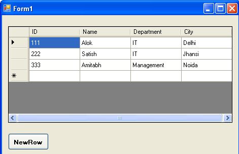 datatable. Take a button > Set it's Text property to "NewRow" and write the following code.