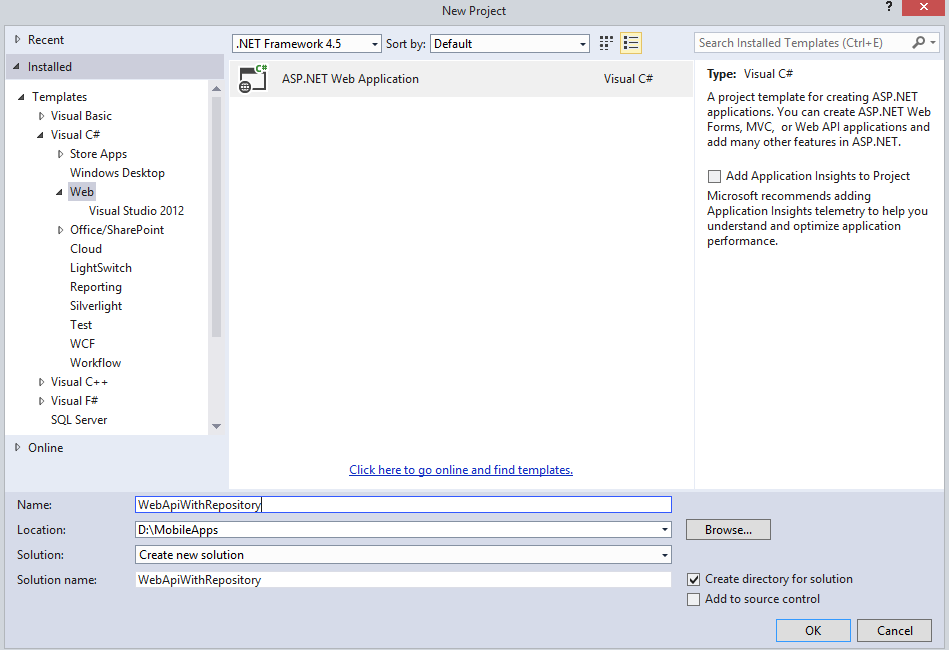 Select New Project and provide a nice name to your application and choose the Web API Template.