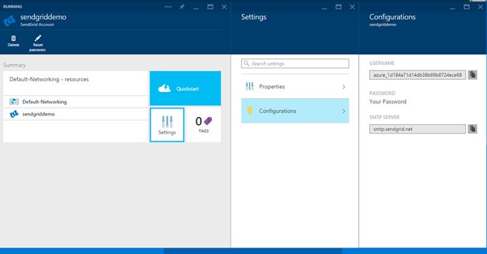 Click on the sendgrid tile in the home dashboard. It will open a blad that shows more information about your SendGrid service. In the following image you can see the two settings: