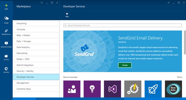 Apart from the preceding tools we can also use the Sendgrid service to send email. It's available in your Azure subscription (marketplace) and has a plan that allows users to send 25,000 emails per month. We will see it in detail in a later part of the article.
