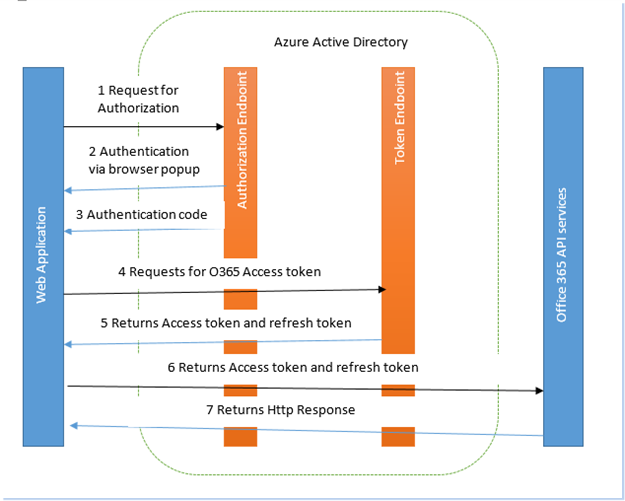 Authentication is the first step to access the Office 365 APIs and it has total 7 steps. Authentication is done using an Azure active directory. It has the two layers Authorization Endpoint and Token Endpoint. Let's see the entire flow one by one.
