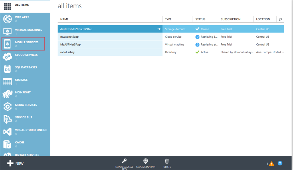 In this segment we'll talk about creating a mobile service in the cloud and then using it in our App. During the course we'll use a variety of technologies. We'll talk about these technologies individually once we progress along the path. So, without wasting time let's go ahead and create a mobile service in Azure. As you can see I'm in the Azure Portal.