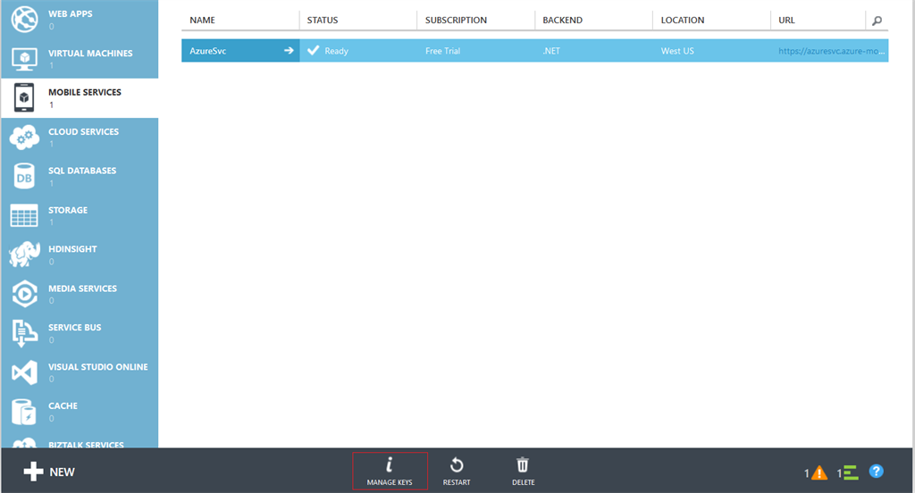 Now, let's go ahead and explore the service. So, here a framework has been installed on the IIS server hosted on Windows Azure that connects to the backend server. This provides REST-based endpoints which means that by using this REST endpoint we can do some operation. As you can see below in the screen shot, our service is created and with the manage keys option I can go ahead and off-course and associate the key with this service.