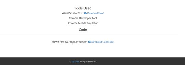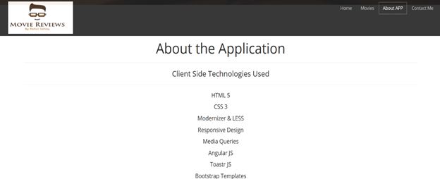 Here, corresponding to the Review, a new Edit link is also enabled for editing or deleting the Review. This also works the same as what I explained above for Movie. The About App link lists all the details of the application, like what technologies are used and what tools you need, where to download the code and so on.