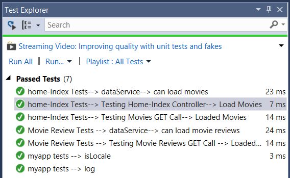 Similarly various endpoints can be tested. Apart from Web API tests, I have also used Jasmine to test my Angular code. You will also learn how to test client-side JavaScript code with Visual Studio. Here, I have used Chutzpah to integrate JavaScript Tests with Visual Studio. The following is a glimpse of it.