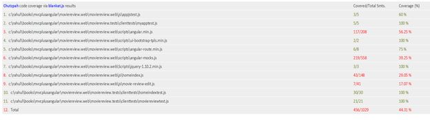 Now, when I check on the code coverage results for my tests, Chutzpah will open a new window in the browser with the code coverage results for the client side as shown below in the screen shot.