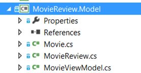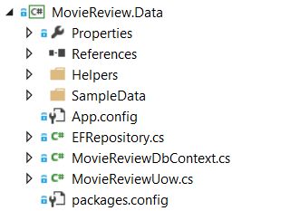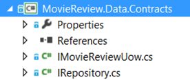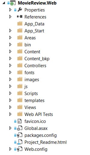 Here, the highlighted one is the web project that is dependent on the other infrastructure projects Data, Contracts and Model. The Data project is the place to maintain the initial seed data, Entity Framework DBContext and many more things involved in the direct interfacing down the layer with database. The Data Contract is the to manage your repositories and apply the Unit of Work Pattern on the repositories like movies and moviereviews. Model is the place where you will be having your Plain Old CLR Objects (POCOs). This is where you are maintaining all the properties attributed to the tables. The following is a glimpse of all the projects in their expanded form.