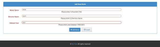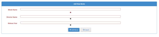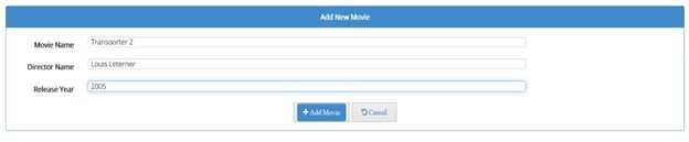Once, the page is loaded, a little toast message at the bottom-right of the screen pops up saying Movies Fetched Successfully. Now, from this screen you can do all the CRUD operations. Here the very first link is Add Movie that will provide the user the flexibility to go ahead and add a new movie as shown below.