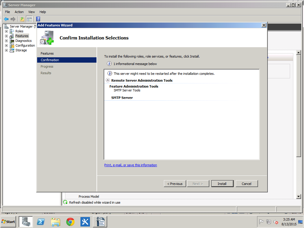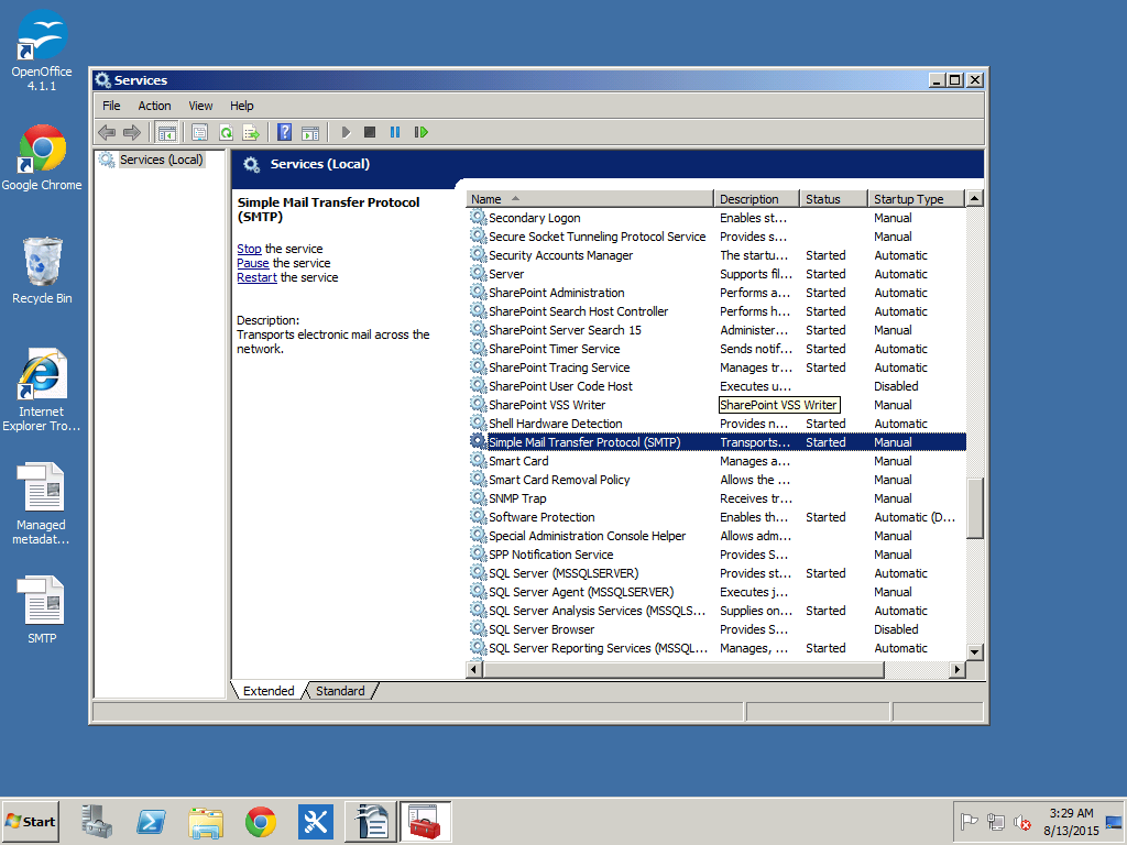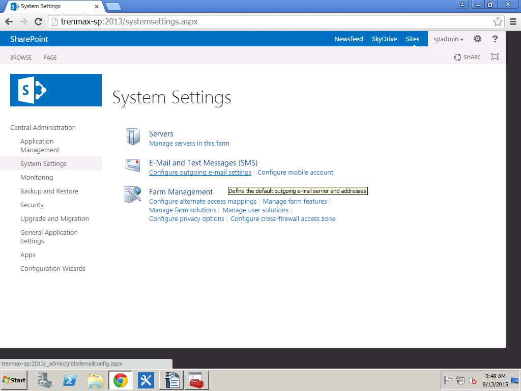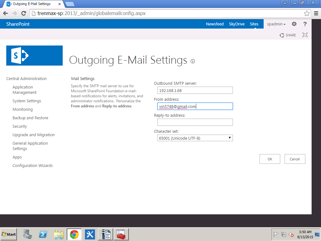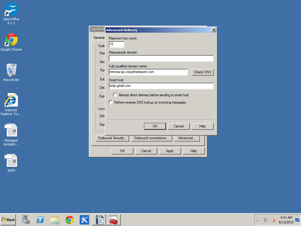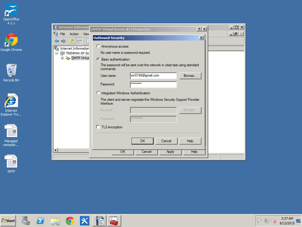 Open server managerFigure 1: Server ManagerFrom the Features tab, click Add Features.Figure 2: Add Feature From this list select SMTP Server.Figure 3: Select SMTP ServerClick Next and then Install to complete.Figure 4: Click Install to CompleteFigure 5: Install ProgressInstallation SucceededFigure 6:Installation SuccessfullClick Close.Open Windows servicesCheck that the SMTP service has been started.Figure 7: Open Windows servicesNow open IIS 6.0 Manager.Figure 8: Now open IIS 6.0 ManagerRight-click on the SMTP Server and click Properties.Figure 9: Click PropertiesIn the General tab under IP address select your local IP address.Figure 10: Select your local IPAddressOn the Access tab, go to Connection.Select All.Figure 11: ConnectionDo the same for Relay.Figure 12: Do the same for RelayClick the Delivery Tab.Figure 13: Delivery TabClick OutBound Security.Click Basic Authentication.Enter your email address and password.Figure 14: Address and PasswordEnable TLS encryption and click OK.Figure 15: Enable TLS encryptionOpen Outbound SecurityChange TCP Port from 25 to 587.Figure 16: Change TCP Port fromClick the Advanced Tab, go to Smart host and write smtp.gmail.comFigure 17: smtp.gmail.comClick Apply and then OK.Open SharePoint Central Administration.Figure 18: Open SharePoint Central AdministrationClick System Settings.Open Configure outgoing email settings.Figure 19: Configure outgoing email settingsEnter Outgoing E-mail Settings and click OK.Figure 20: Happy SharePoint