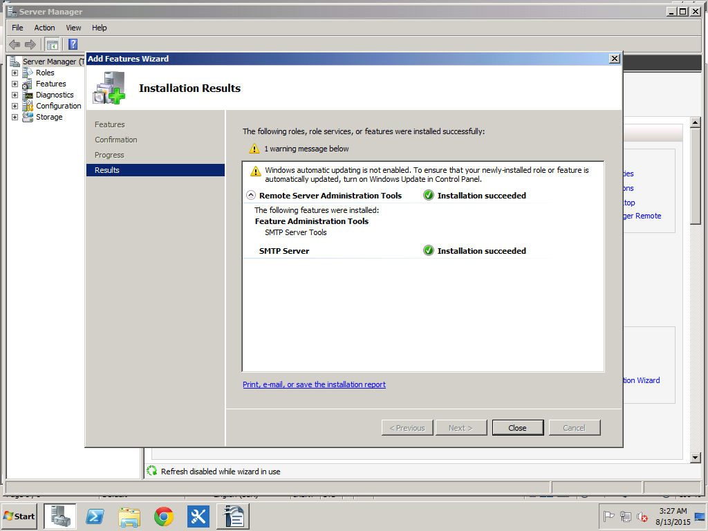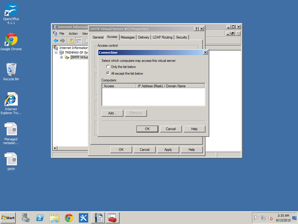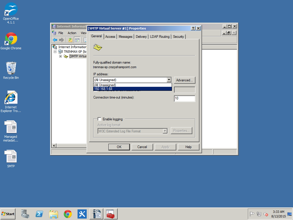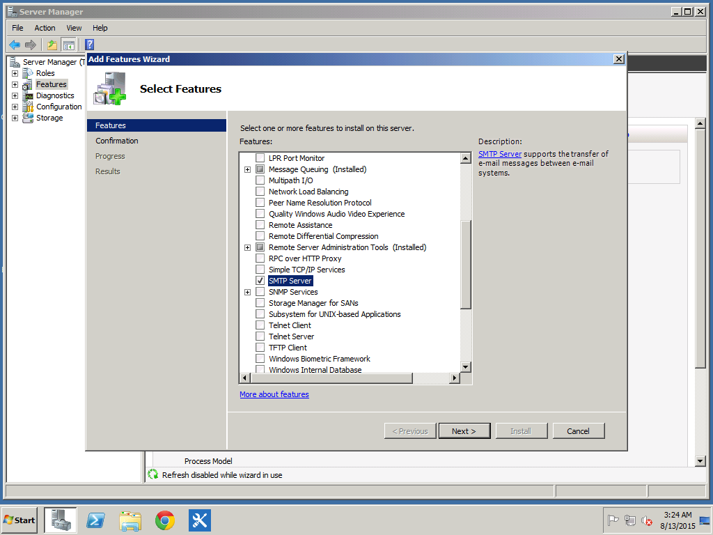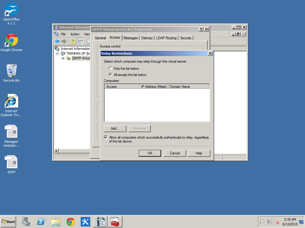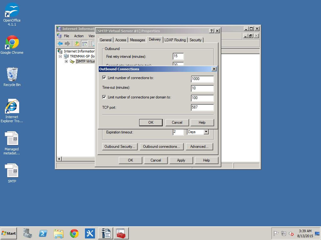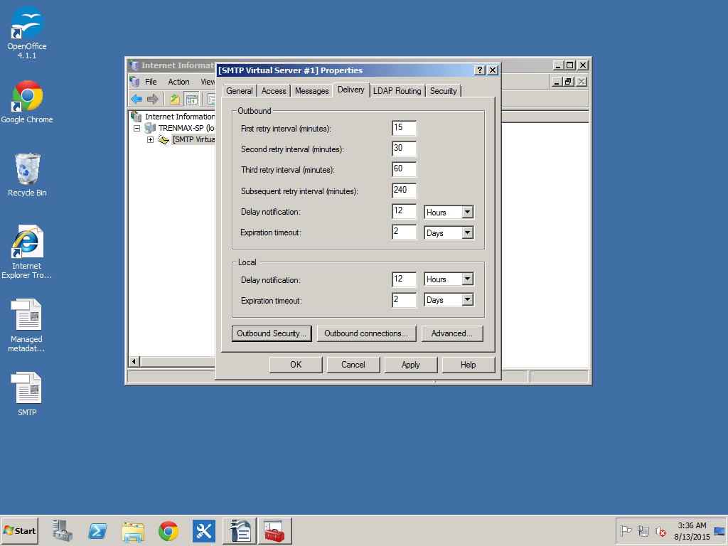 Open server managerFigure 1: Server ManagerFrom the Features tab, click Add Features.Figure 2: Add Feature From this list select SMTP Server.Figure 3: Select SMTP ServerClick Next and then Install to complete.Figure 4: Click Install to CompleteFigure 5: Install ProgressInstallation SucceededFigure 6:Installation SuccessfullClick Close.Open Windows servicesCheck that the SMTP service has been started.Figure 7: Open Windows servicesNow open IIS 6.0 Manager.Figure 8: Now open IIS 6.0 ManagerRight-click on the SMTP Server and click Properties.Figure 9: Click PropertiesIn the General tab under IP address select your local IP address.Figure 10: Select your local IPAddressOn the Access tab, go to Connection.Select All.Figure 11: ConnectionDo the same for Relay.Figure 12: Do the same for RelayClick the Delivery Tab.Figure 13: Delivery TabClick OutBound Security.Click Basic Authentication.Enter your email address and password.Figure 14: Address and PasswordEnable TLS encryption and click OK.Figure 15: Enable TLS encryptionOpen Outbound SecurityChange TCP Port from 25 to 587.Figure 16: Change TCP Port fromClick the Advanced Tab, go to Smart host and write smtp.gmail.comFigure 17: smtp.gmail.comClick Apply and then OK.Open SharePoint Central Administration.Figure 18: Open SharePoint Central AdministrationClick System Settings.Open Configure outgoing email settings.Figure 19: Configure outgoing email settingsEnter Outgoing E-mail Settings and click OK.Figure 20: Happy SharePoint