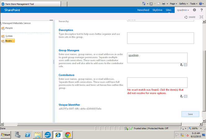 Enter SPAdmin as group manager permissions.