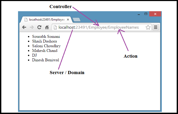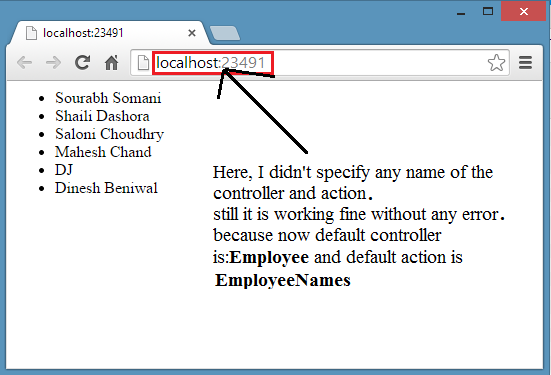 In the preceding example we have a controller named:EmployeeController and the action is EmployeeName. So we will request the controller using the URL. If we see our URL then it is "http://localhost:23491/". Now we will request the controller like as follows: