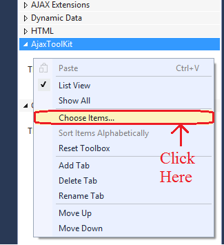 Step 3: Now create a new website and add the downloaded AjaxToolkit into the toolbox as in the following: