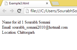 - document.getElementById("result").innerHTML = "Name for id 1 " + req.result.Name + "<br/>Email: " + req.result.Email + "</br>Location: " + req.result.Location;